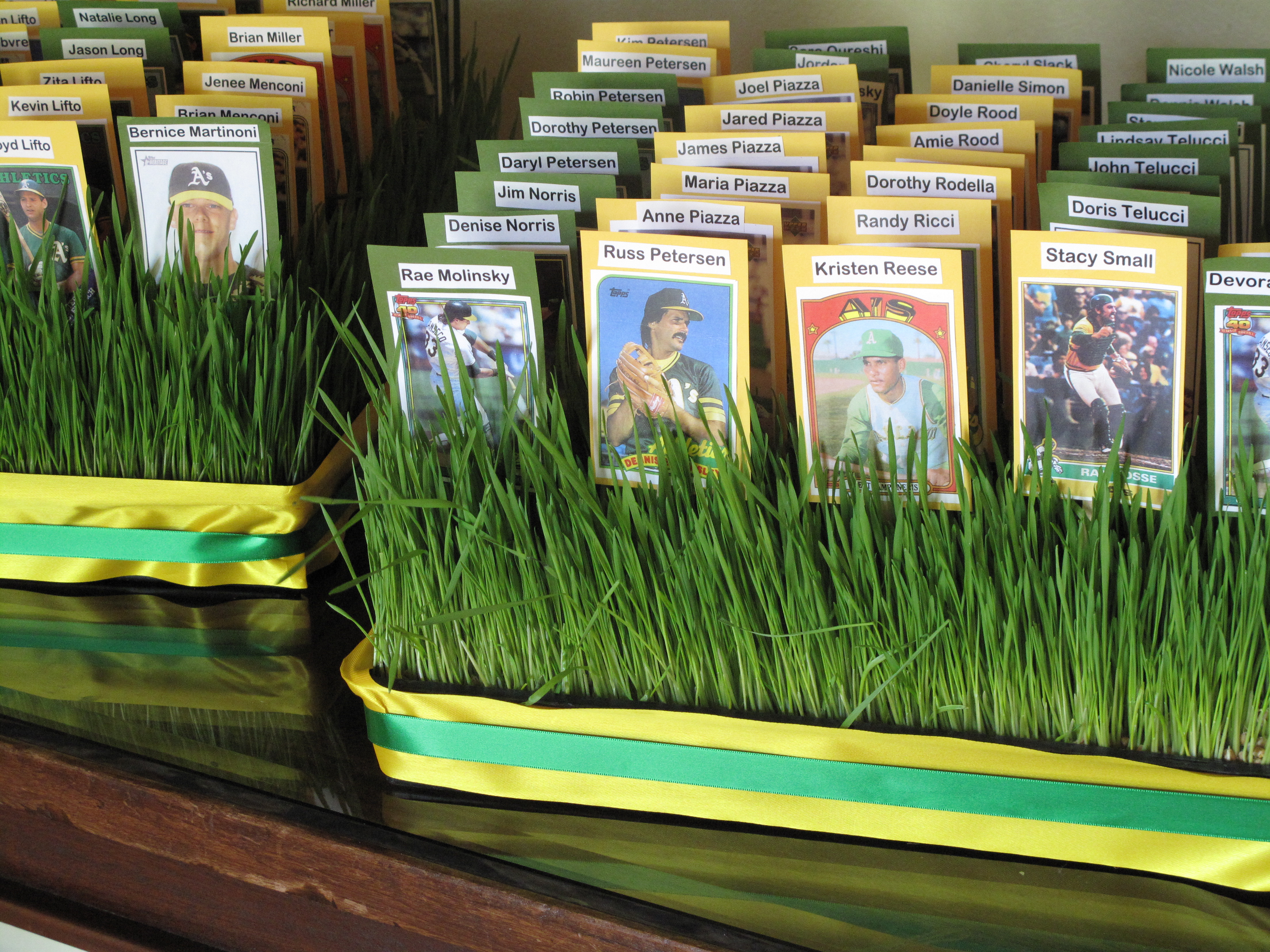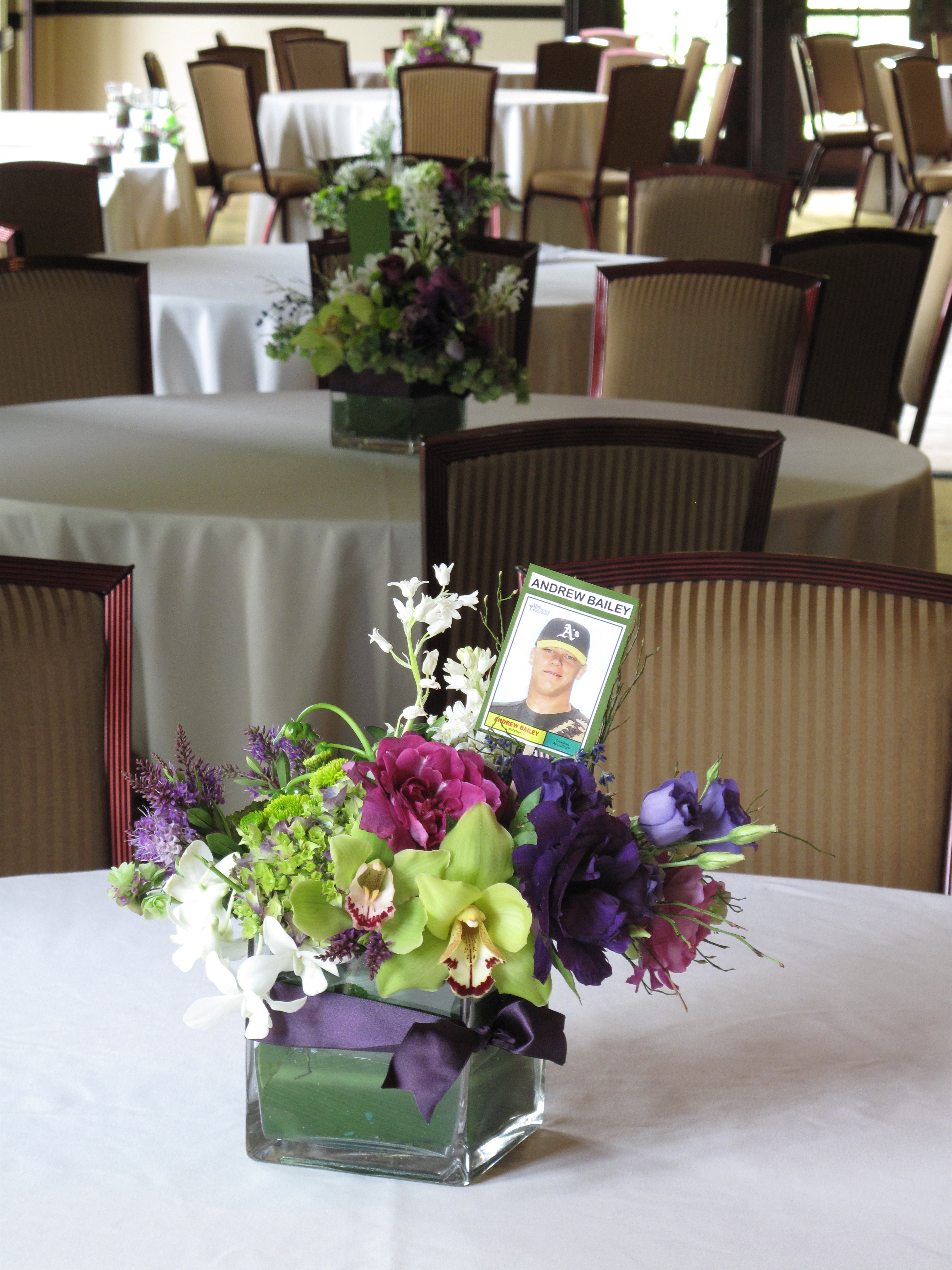 This past Saturday, we had the pleasure of helping Andrea and Craig with their wedding at Our Lady of Loretto, and the reception at StoneTree Golf Club. Wedding coordination was directed by the talented Amanda Schroeder. Colors styled into the event included aubergine, greens, and charcoal, and guests found their way to their tables by way of a baseball field built of wheat grass, picked with cards of 15 current and former Oakland A’s players. As a Giants’ fan, I pushed through this project with the bride’s encouragement, further encouraged by the spirit of Dusty Baker, Ray Fosse, Catfish Hunter, Dave Stewart, Nick Swisher, and Bert Campaneris. All, exceptional players at the greatest show on earth. Andrea and Craig, you are delightful, you are pure joy. Continued great wishes to you and your families.
