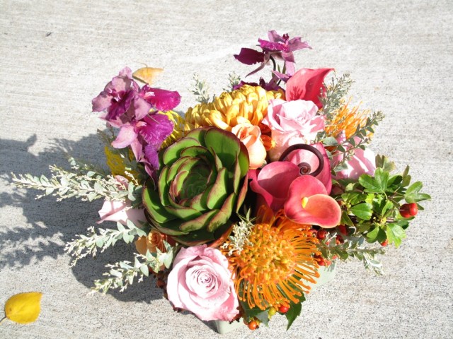 Repurposing: When the fresh cut floral design has expired, re-cut the succulent stem, place in a vase of water to set roots (2-3 weeks) and plant in your garden for years of enjoyment.